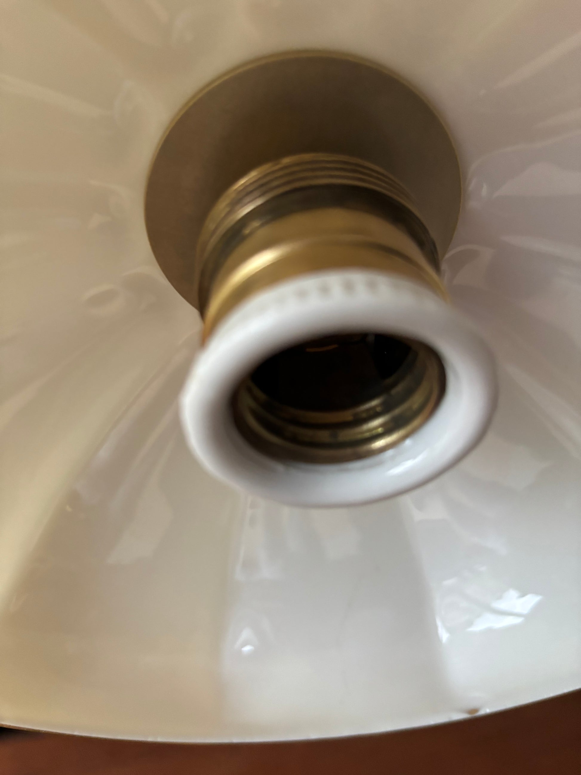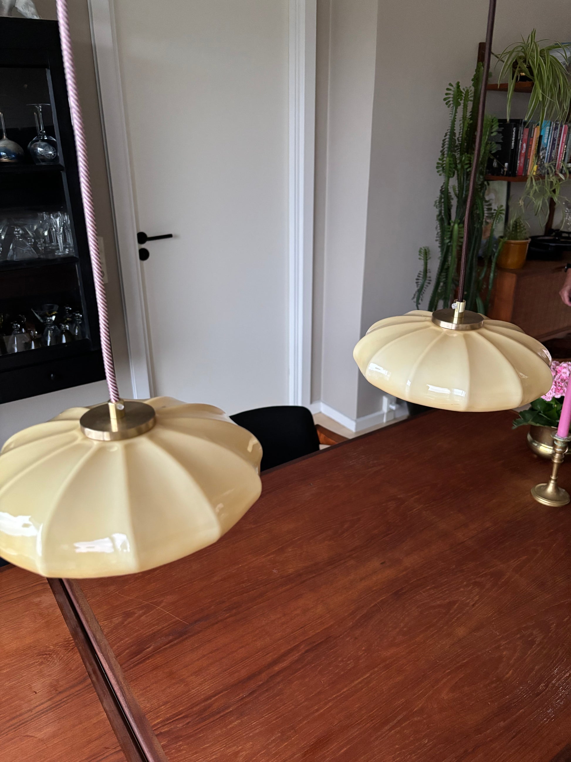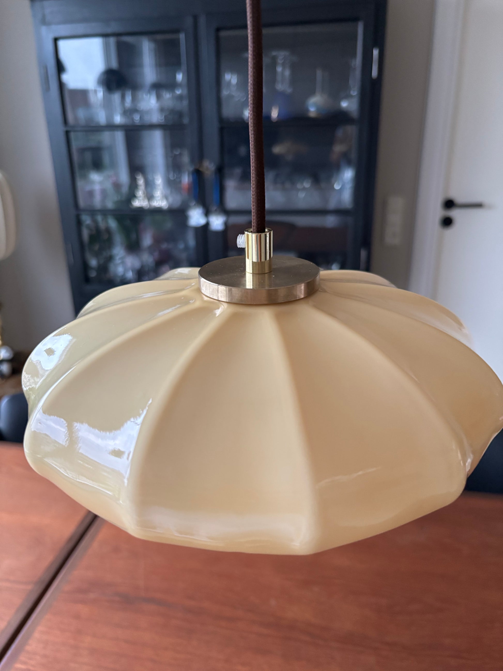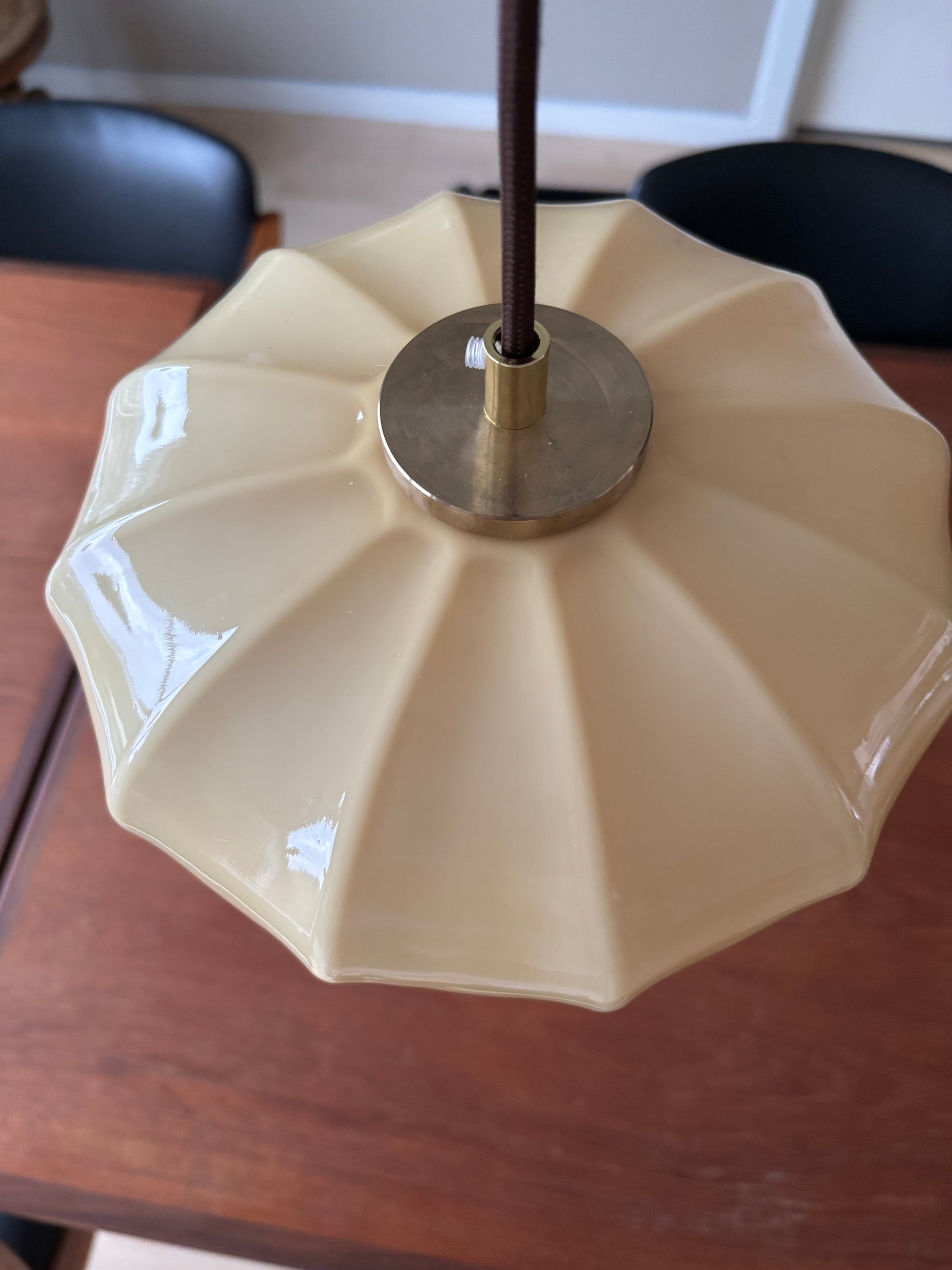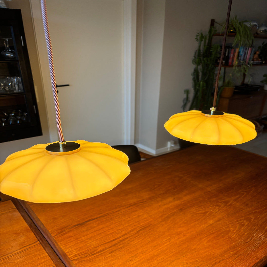 Utrolig smukt sæt glas pendler. Glas paraply skærme fra 40'erne. Der er monteret special designet messing skærmholder, messing/porcelæn fatninger og 2m stofledning.